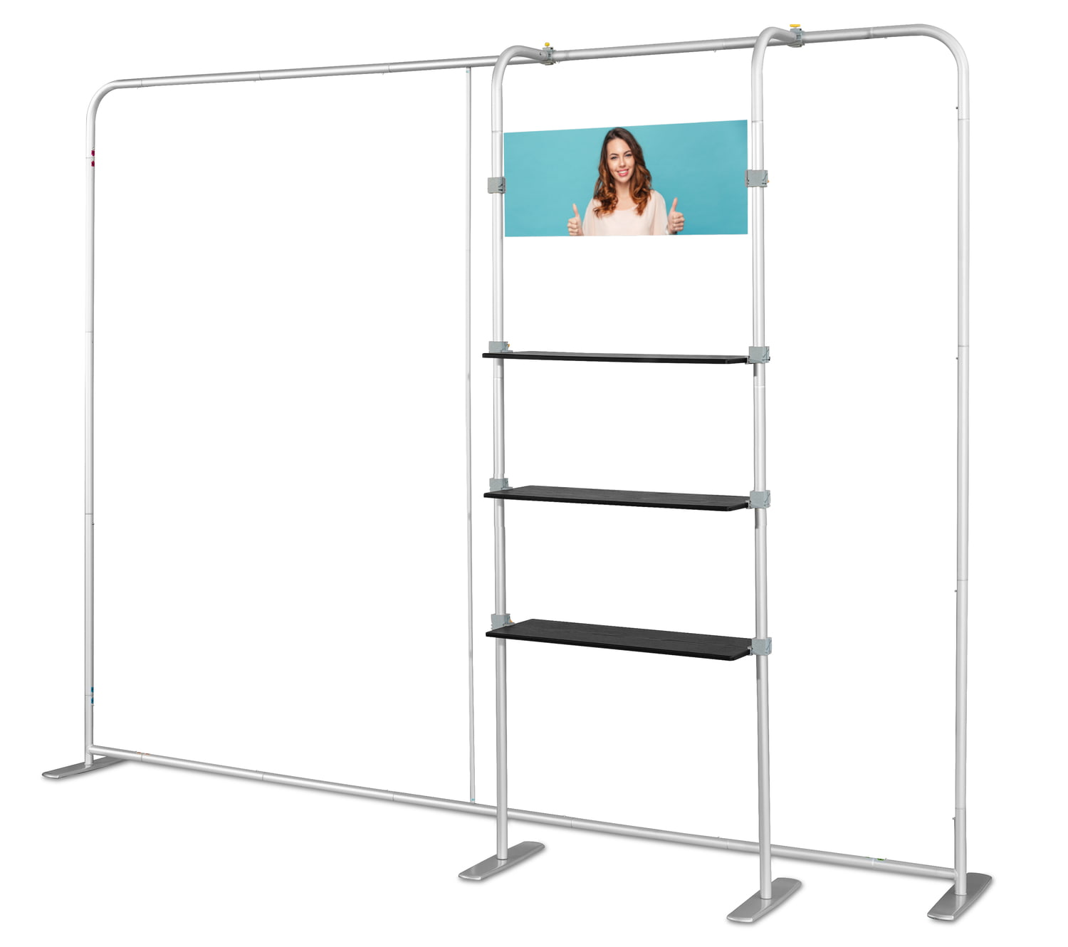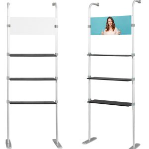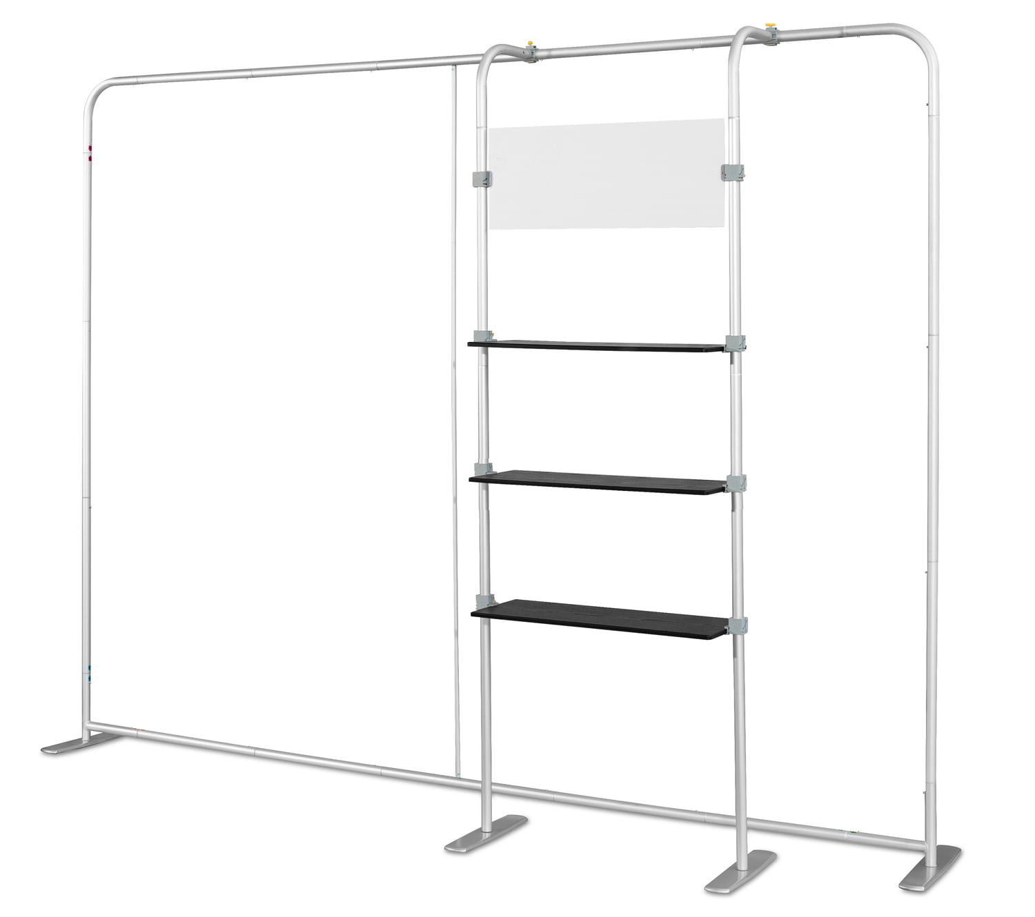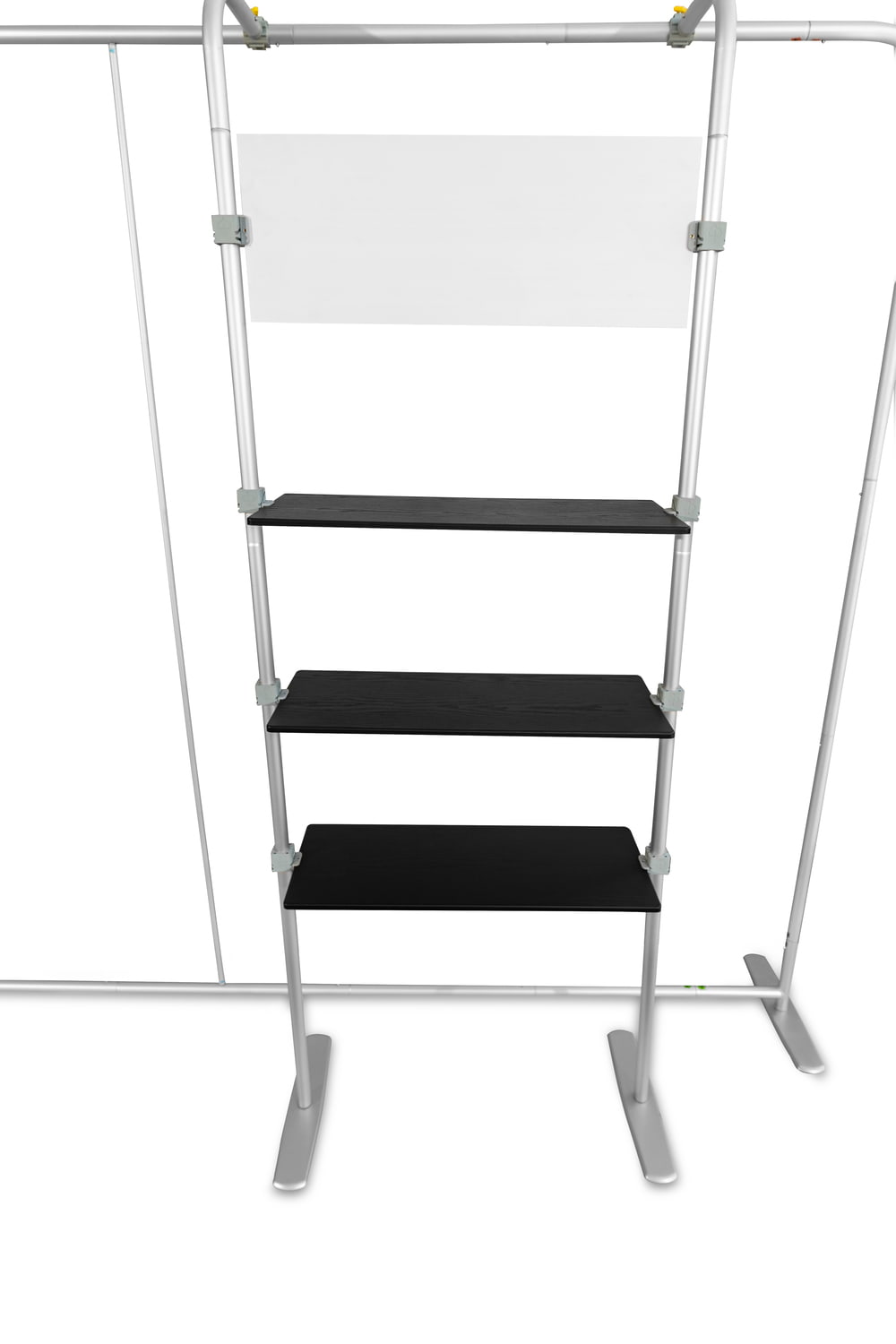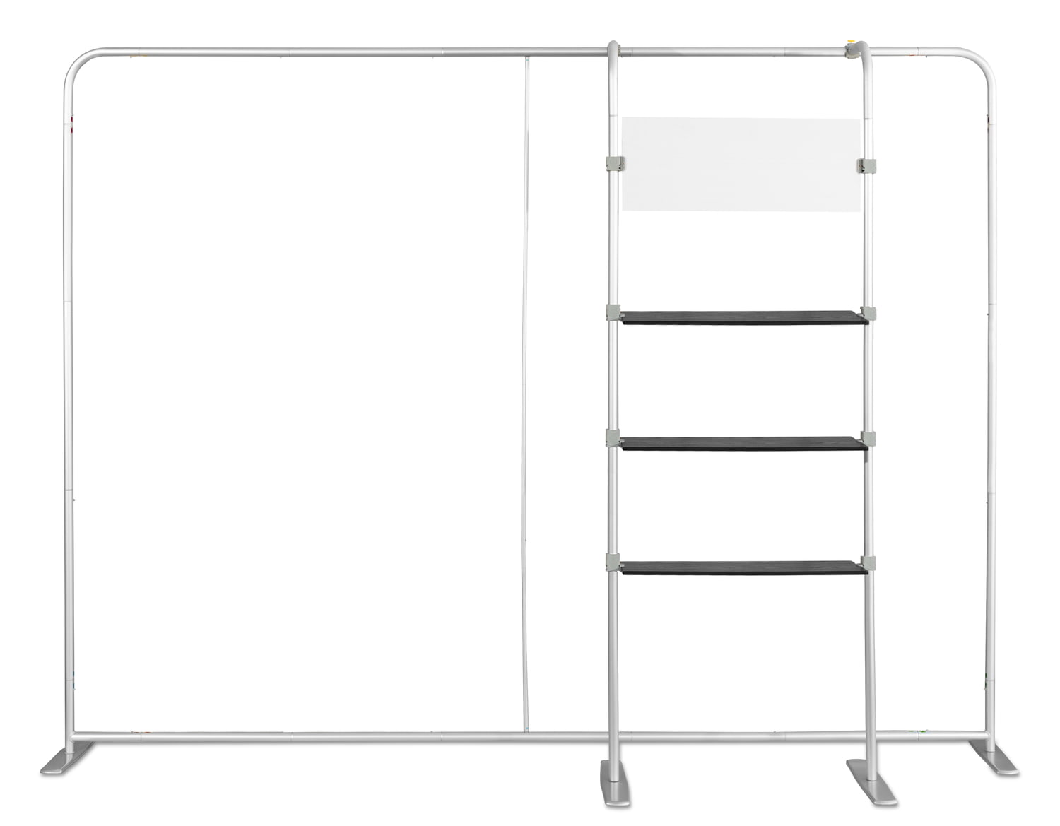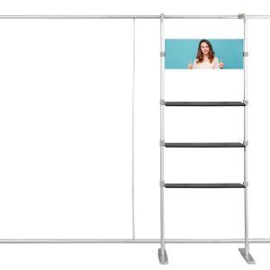 COMBI 1 prailginimas Atlantis tiesioms sienoms. Lentynų sistema Atlantis (tiesiems) sienoms. Dėl šio paprasto sprendimo kiekviena siena gali tapti pilnaverte, nepriklausoma ir labai funkcionalia parodų sistema. Puikiai tinka reklaminiams, edukaciniams ir mugių stendams. Sistema turi 3 horizontalias juodas lentynas, pagamintas iš storo plastiko, imituojančio medieną. Viršutinėje sistemos dalyje yra lenta, ant kurios galima spausdinti įmonės logotipą ar kitą grafiką (folija). Dėmesio! Šio pirkimo objektas yra tik COMBI 2 sistema. Atlantis sieną reikia įsigyti atskirai.