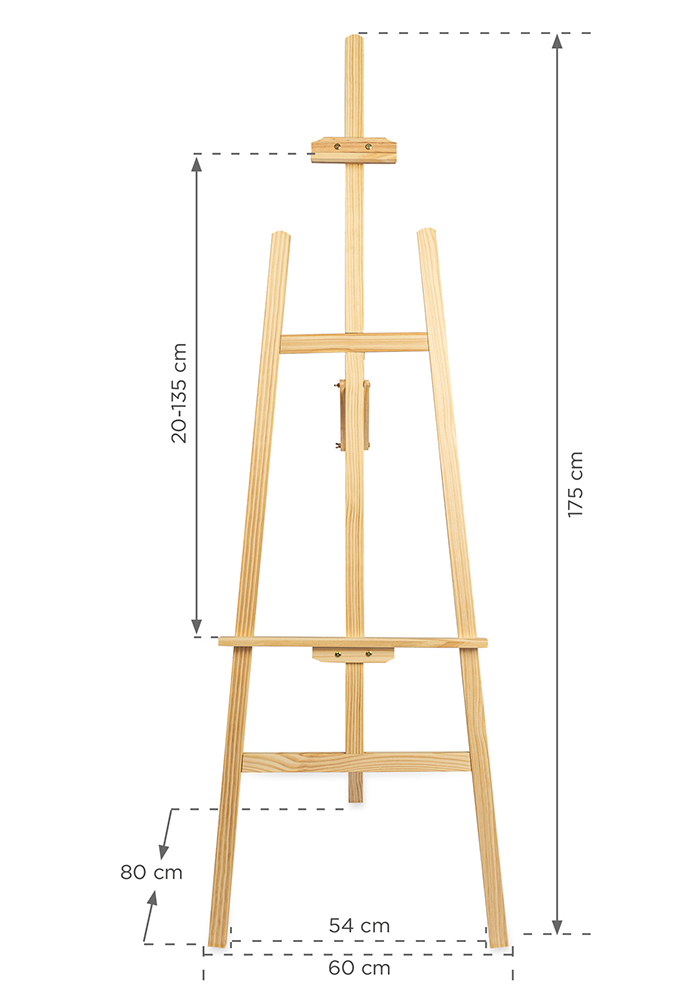 Dėmesio! Dėl tiekėjo pasikeitimo, be kita ko, pasikeitė siūlomos medienos rūšis. Dėl natūralios žaliavos kilmės gaminio išvaizda gali skirtis priklausomai nuo partijos. Medinis molbertas, pagamintas iš pušies medienos, pasižymi labai stabilia ir lengva konstrukcija. Apatinė lentyna kartu su viršutine rankena užtikrina tvirtą laikymą ant rėmo ar lentos. Platus jų reguliavimo diapazonas leidžia eksponuoti įvairaus dydžio paveikslus. Molbertą galima lengvai ir greitai sulankstyti, todėl jį daug lengviau laikyti ir transportuoti. Siūlomas gaminys yra idealus sprendimas tiems, kurie ieško klasikinio ir elegantiško eksponato parduotuvei, galerijai ar restoranui. PRODUKTO PRIVALUMAI: – stabili, medinė konstrukcija – reguliuojamas. Komplektą sudaro: savarankiškai surenkamas molbertas, surinkimo instrukcijos, individuali kartoninė dėžutė.