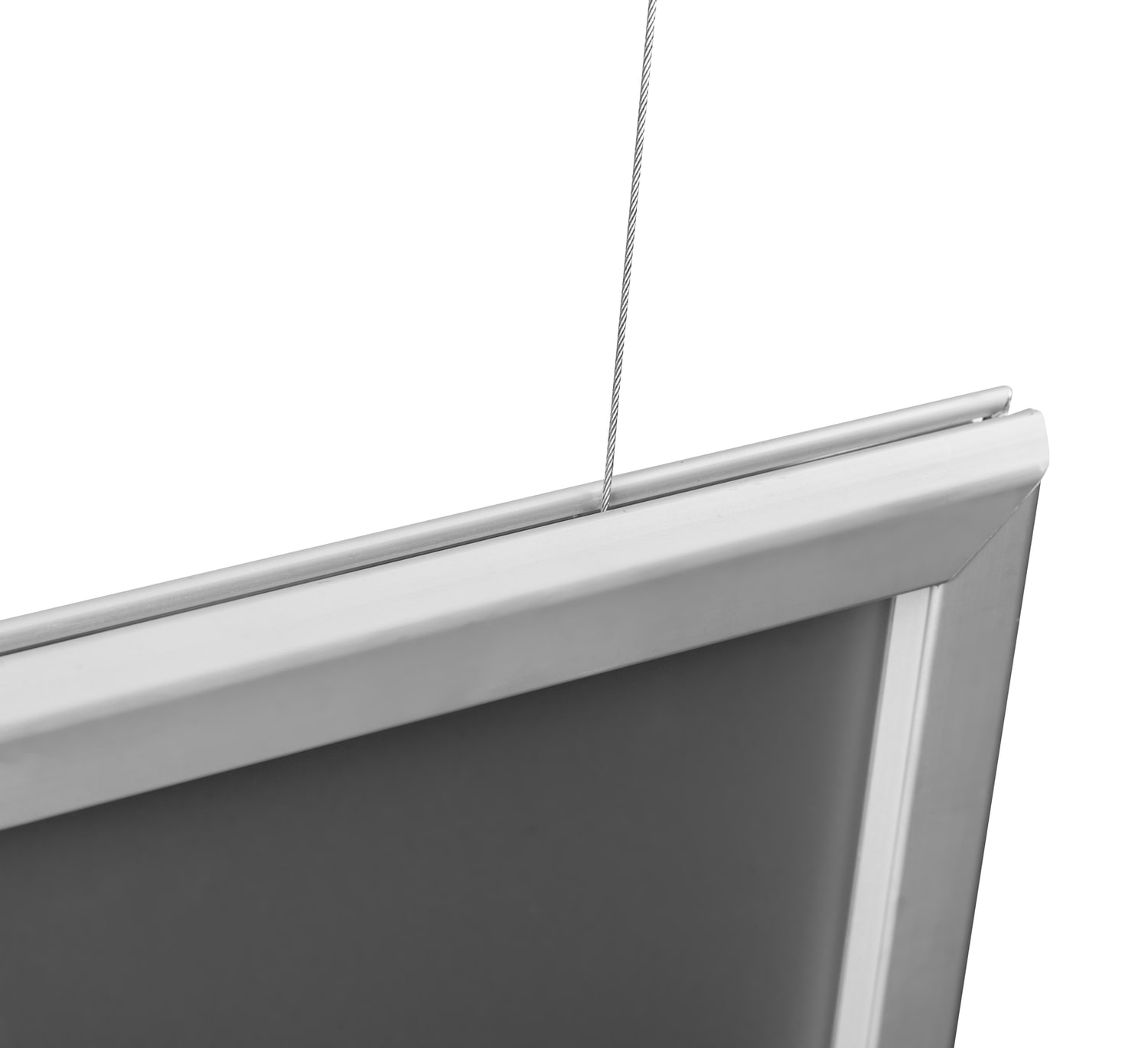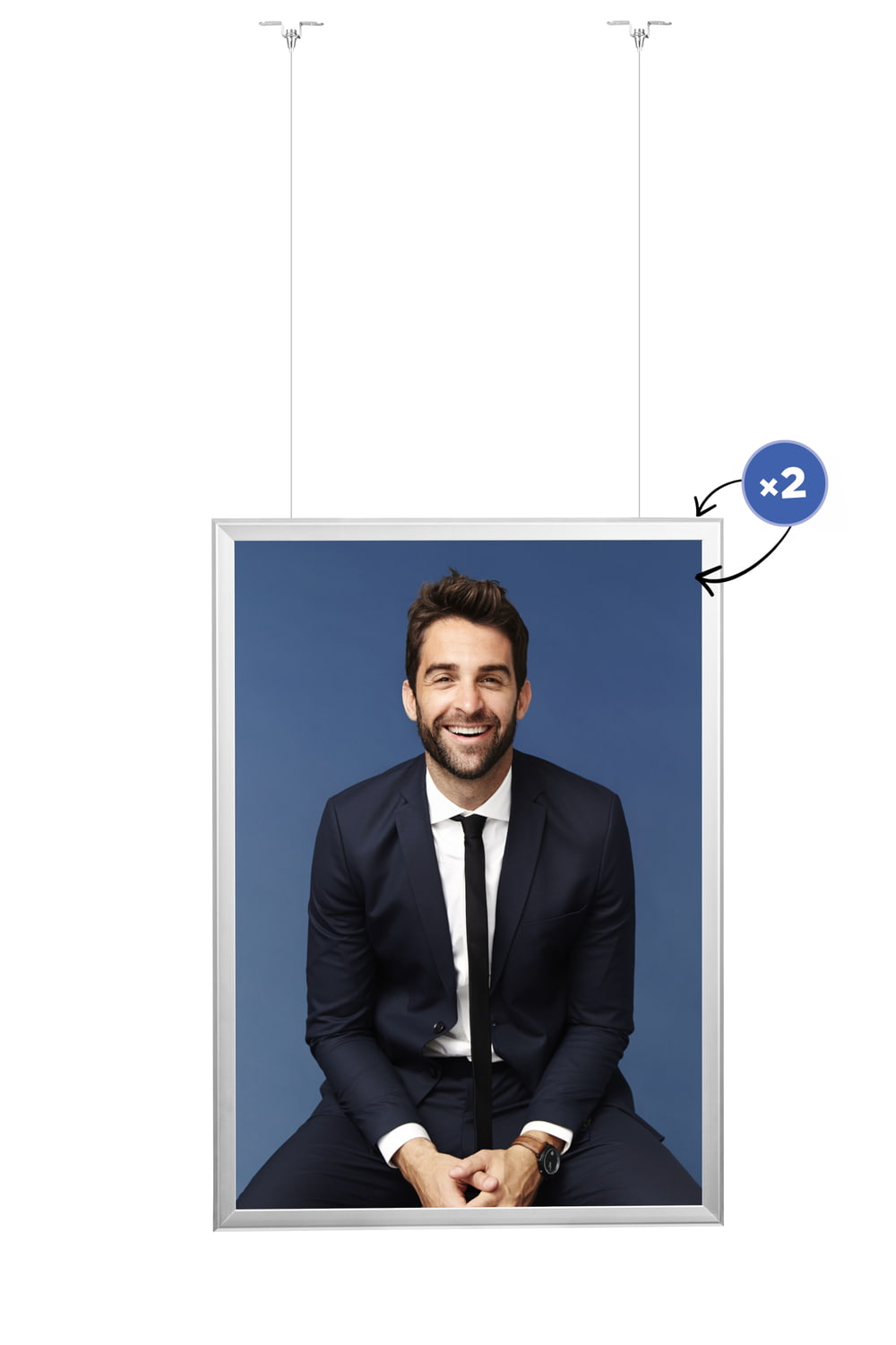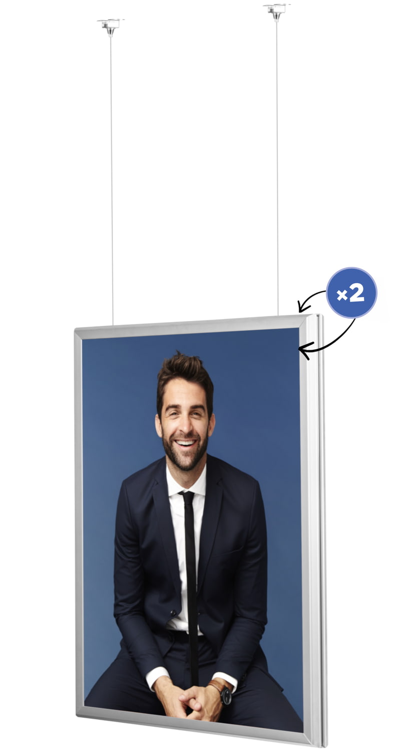 Puikus sprendimas didelėms parduotuvėms ir prekybos centrams. Šis „Premium“ tipo rėmas leis pateikti grafiką iš abiejų pusių. „Clip-clap“ sistema leidžia greitai ir be problemų pakeisti plakatą, kuris trunka vos kelias sekundes. Tvirtas plieninis lynas garantuoja saugų ir stabilų rėmo pakabinimą. Komplekte yra laikikliai rėmo tvirtinimui prie lubų. Į komplektą įeina: „Vertico A1“ rėmas, 150 cm plieninis lynas, tvirtinimo plokštės.